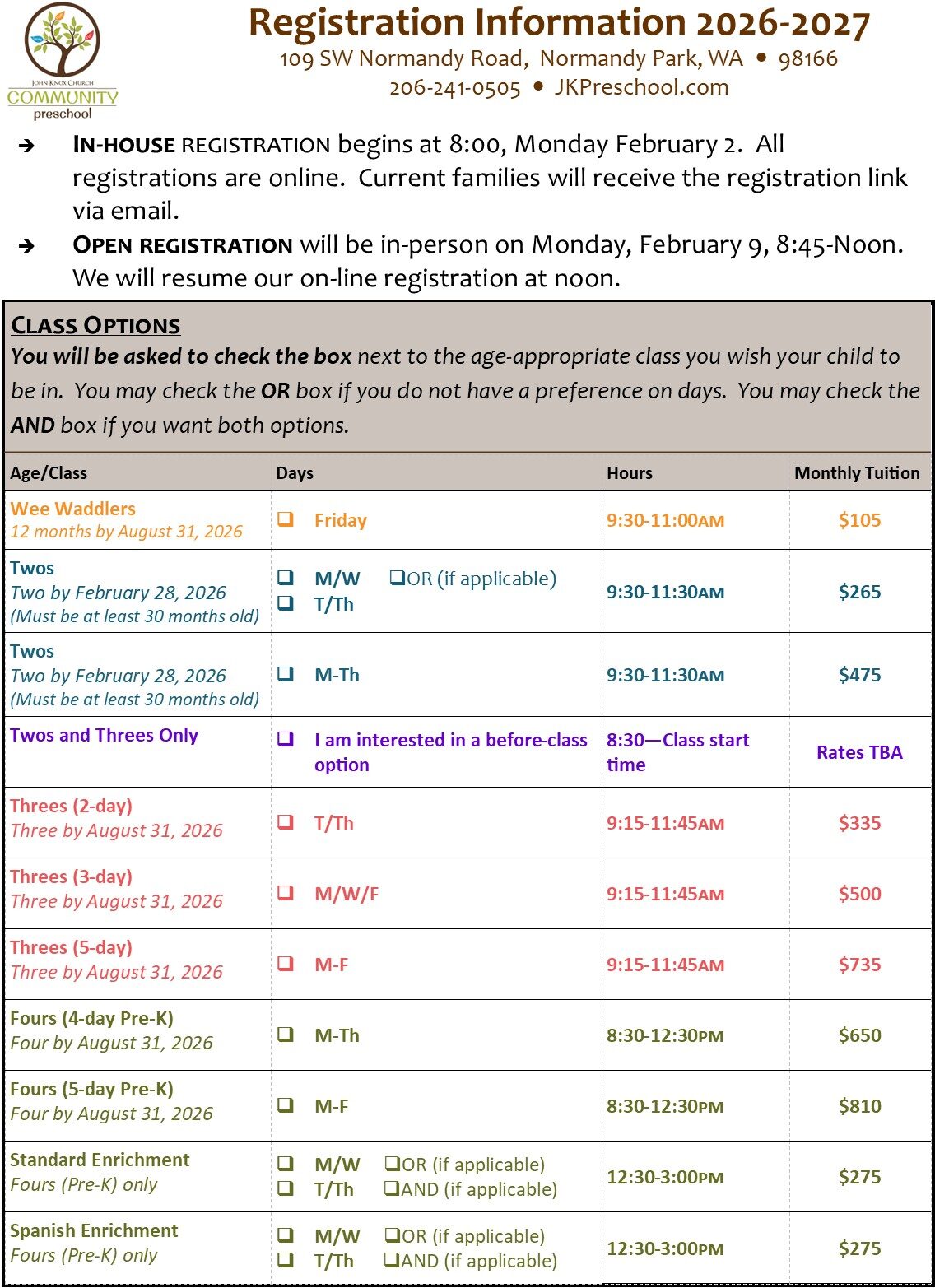 New families to the preschool may begin registering through this page beginning Monday, February 9, 2026 at noon. Due to in-house registration, some class options may be limited. To ensure an understanding of what is available, we offer in-person registration on Monday, February 9, from 8:45-noon.